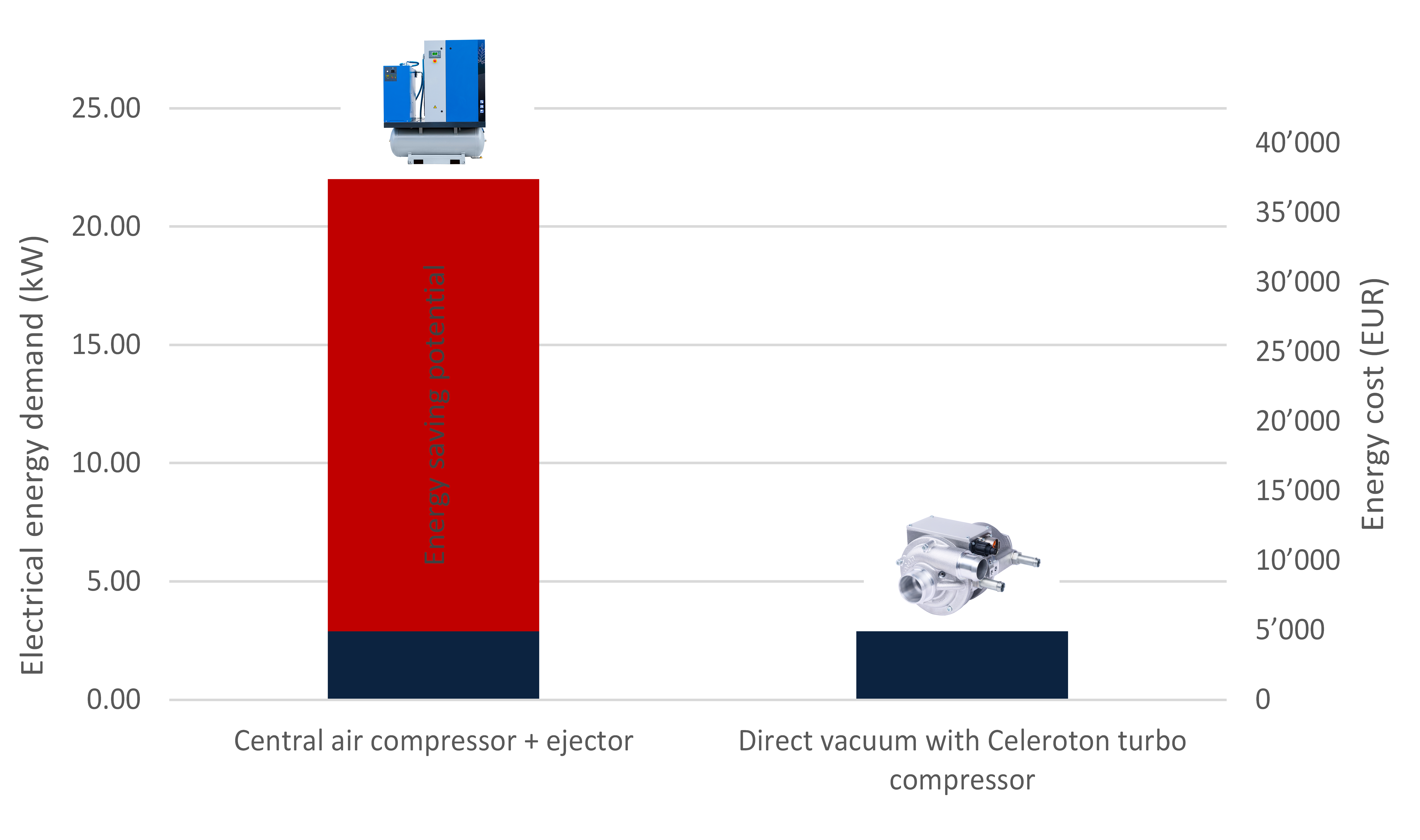For this exemplary equipment we consider vacuum grippers with a typical porous material vacuum requirement of 450 mbar (0.55 bara) and total flow requirement of 2000 l/min. The vacuum can be generated by 9 ejectors supplied by a continuously running central industrial air compressor with an average power consumption of 22 kW. Or with direct vacuum generated by a Celeroton turbo compressor CT-2000 with an operating point at pressure ratio 1.8 and 40 g/s, which leads to an input power of around 2.9 kW. 7.5x lower than the central compressor with an ejector solution. This means savings of >32’000 EUR each year (Assumptions: 8500h operation with an energy price of 20 ct/kWh).