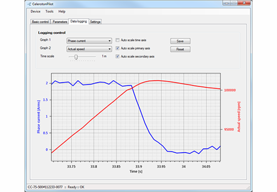 Due to the higher sampling rate of 50 Hz, many more measurement values are now available. As before, two user-defined measurement variables are displayed but we have a newly optimized plotting display that allows zooming of any area or scaling of the axes to give you a quick insight of the results.