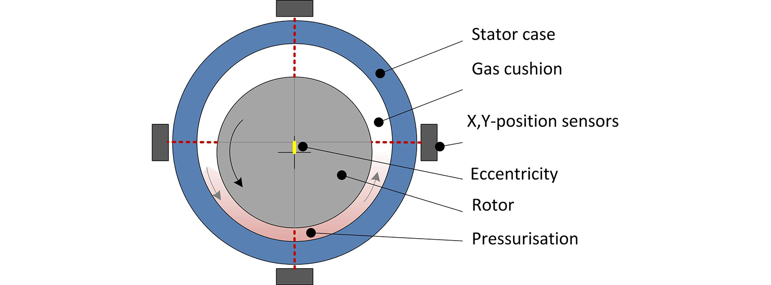 The commissioning can be easily carried out by the team at Celeroton thanks to their design and test knowhow and the infrastructure available at Celeroton. Besides determining the key parameters of the motor, the functionality and stability of the radial and axial gas bearings are permanently monitored. The stability depends on, for example, the actual fluid composition, speed, actual absolute pressure ratio and the temperature. More information on this topic can be found in the technology section on our website. The use of appropriate sensor technology for the monitoring of the rotor excursion and rotor stability creates a high degree of certainty during the first commissioning and additionally allows for comparison between the calculated and measured parameters. Celeroton uses its own self-developed and highly sensitive sensors. These sensors are based on the eddy current principle and measure extremely small displacements of the rotor in the stator case during operation. Figure 1 graphically shows the starting position of the rotor and the gas bearing stator case in a cross sectional view. The distances of the deflected rotor to the eddy current sensor are depicted with red lines, with the resulting eccentricity is shown as a yellow line. This sensor technology is used for the commissioning of gas bearing turbo compressors with and without air.